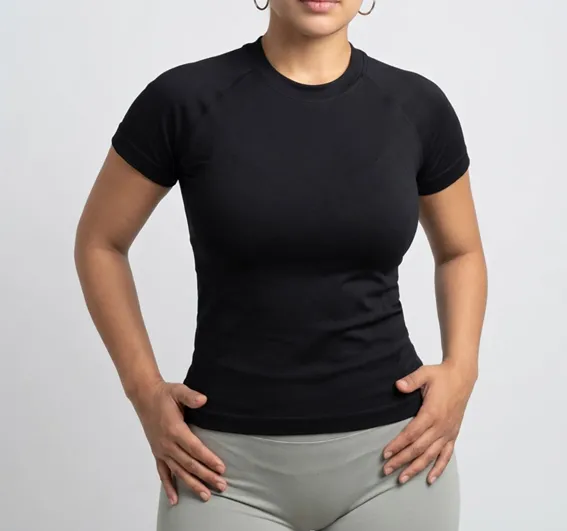 Camiseta deportiva compresora para mujer de alta elasticidad, diseñada para brindar soporte, ajuste firme y libertad de movimiento. Ideal para gimnasio, running, yoga y entrenamiento intenso.